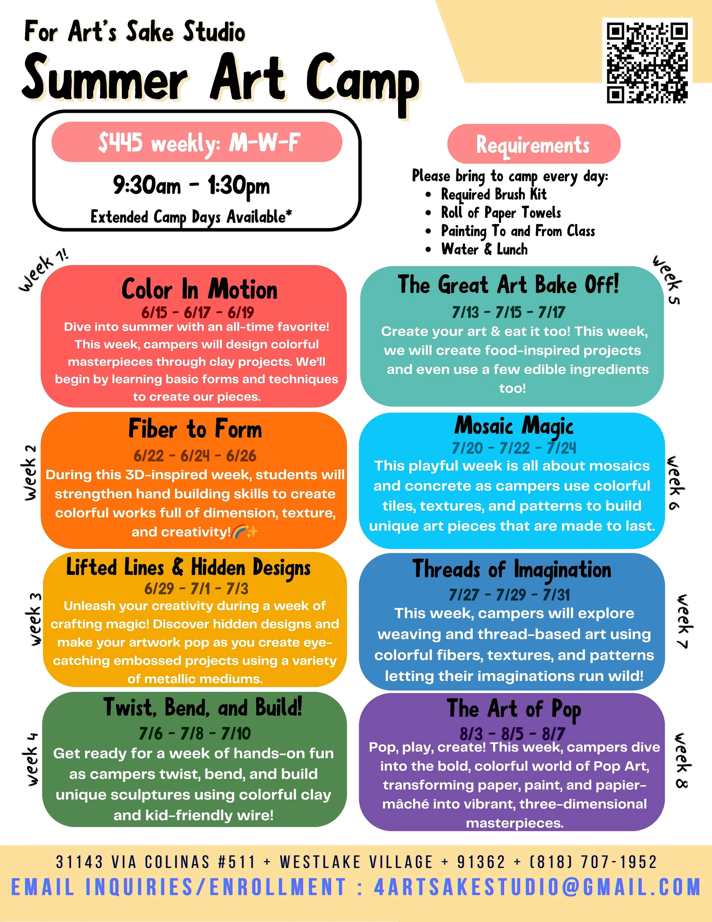 SUMMER ART CAMP | 2026 | June 14th - August 7th | 8 weeks available (* WEEK 9 TBD, BY APPT ONLY.)